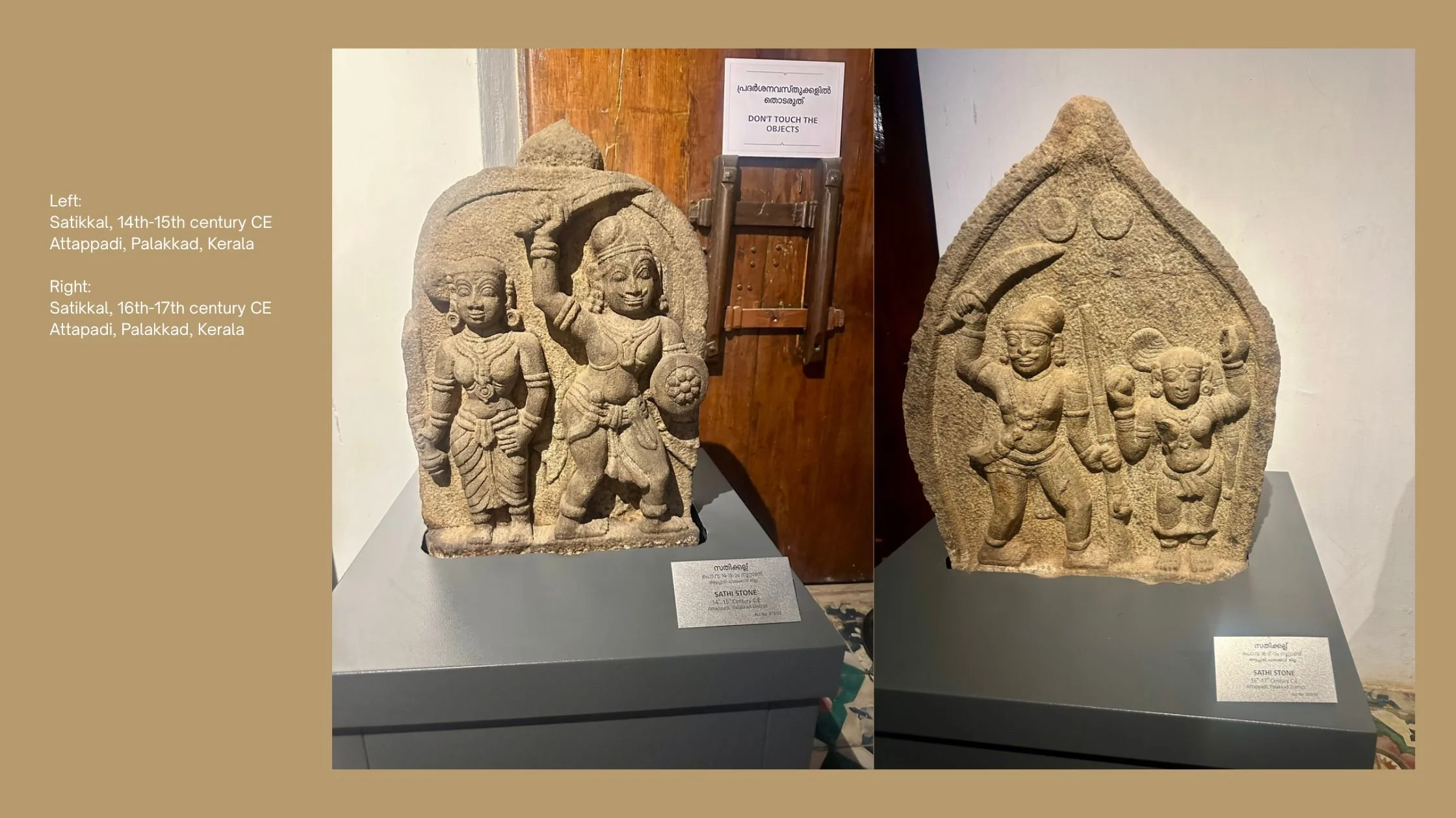 Among these are the two Satikkal pictured above, tentatively dated to the 14th–15th and 16th–17th centuries. Both were found in Attappadi, Palakkad district. Their dating, if you ask me, is uncertain — and that in itself feels fitting. So much of women’s history sits in that gray space between record and recollection. But the iconography is unmistakable: a husband shown armed, perhaps mid-battle, and beside him, the woman who followed him into death — hands raised in gesture, holding attributes that mark her devotion.